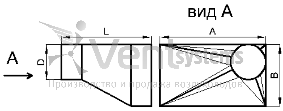 Данный переход стыкует прямоугольные воздуховоды с круглыми. Смещение является угловым вправо.